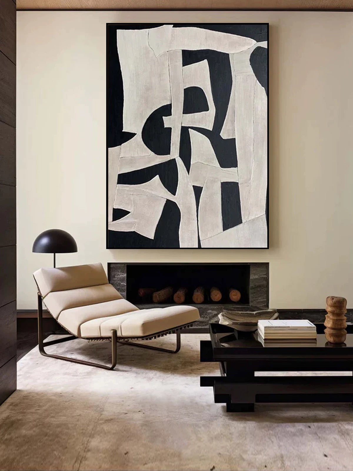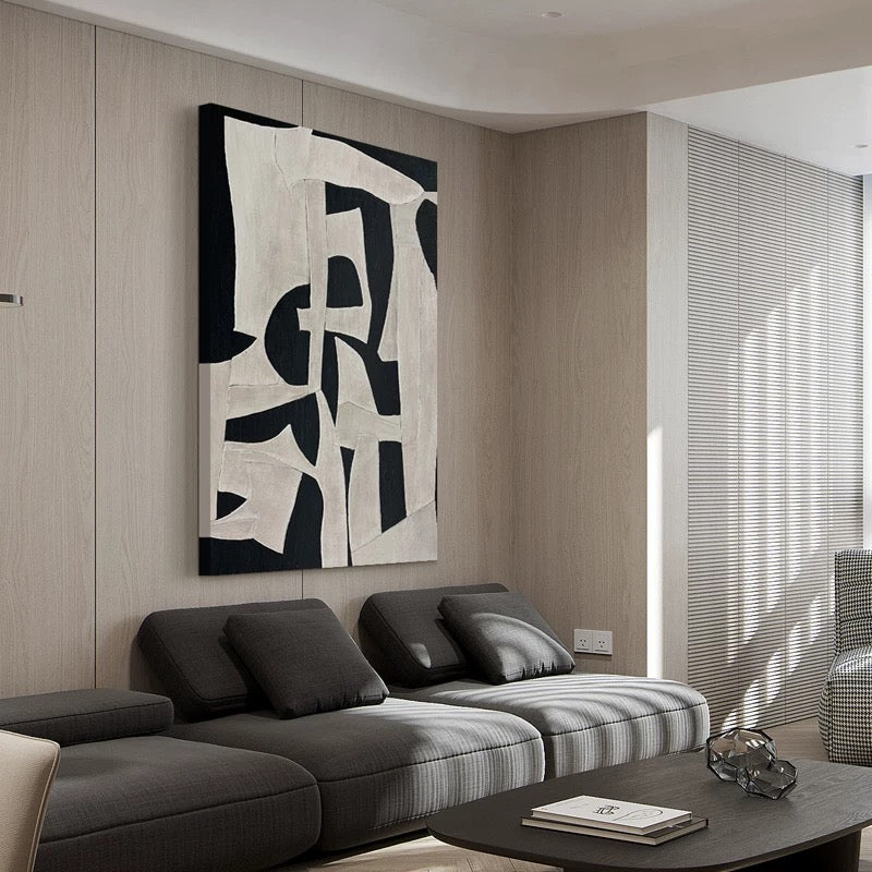 The bold, high-contrast monochromatic design—combining deep true black with layered ivory and off-white shapes—adds sophistication and depth to any modern, contemporary, or minimalist interior. An unforgettable statement piece for your living room, office, or loft space.