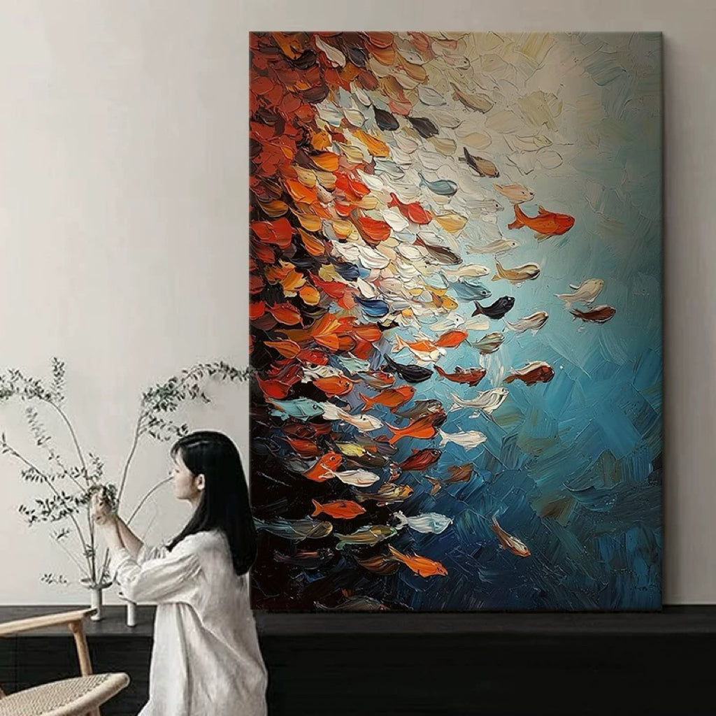 Inject vibrant, dynamic energy into your space with Artallin’s Dynamic Impasto Fish School Painting. This spectacular hand-painted artwork captures the powerful movement of fish schooling in a sweeping vortex. The composition features a striking high-contrast division between fiery Orange and deep Blue tones, symbolizing balance and energy.