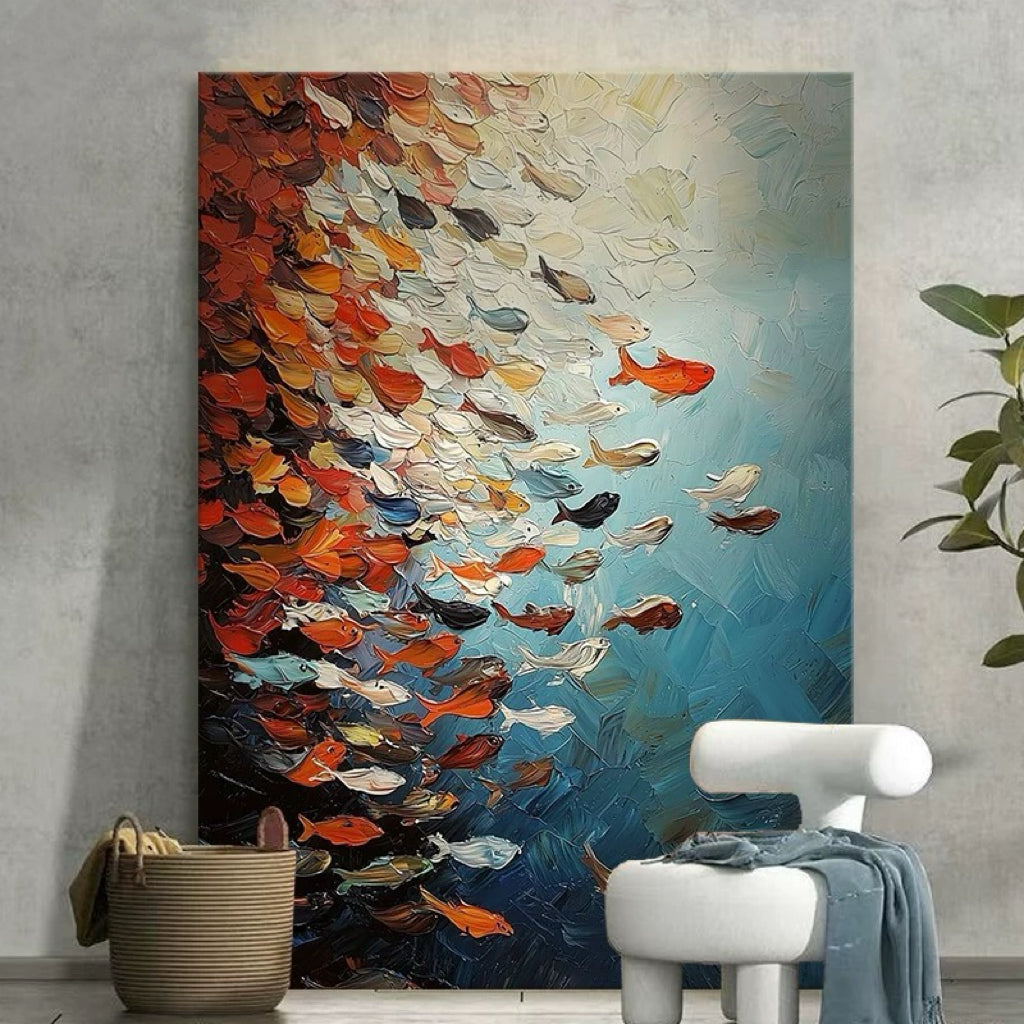 Each fish and current is rendered using heavy, palpable impasto, resulting in a unique 3D texture that makes the canvas feel alive and in motion. An unforgettable statement piece for living rooms, dining areas, or homes near the coast.