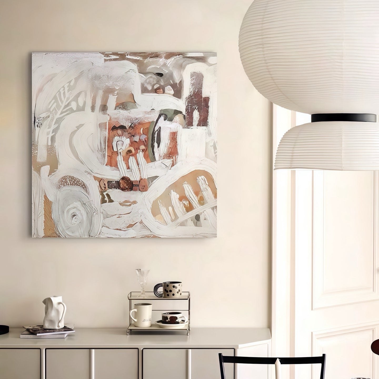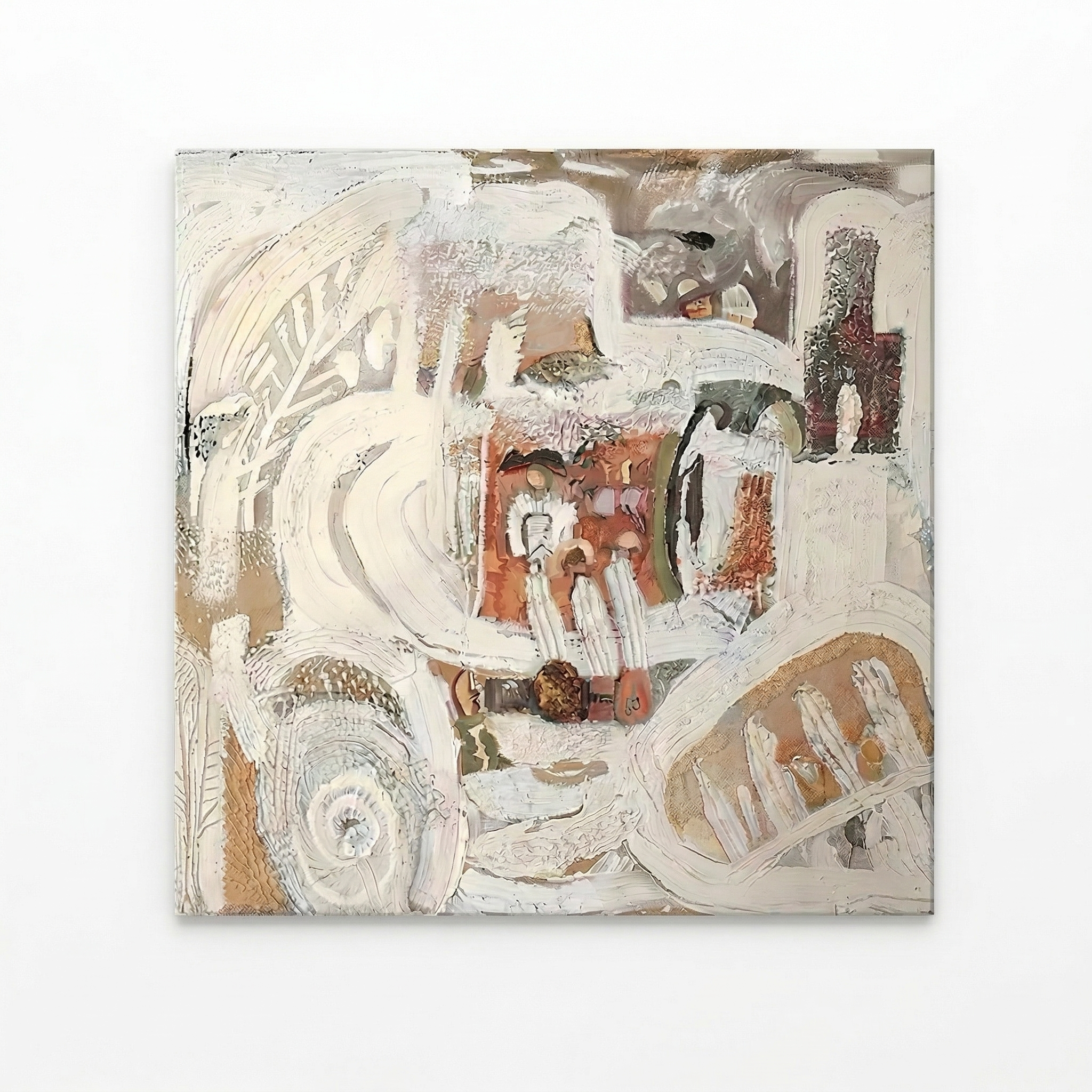Bring a sense of tranquil, dreamlike elegance to your home with Artallin’s "Ethereal Neutral Abstract Painting." This exquisite hand-painted artwork features a soft, fluid blend of creamy whites, gentle beiges, and pale greys that create an expansive, airy background. The composition is gently grounded in the lower section by organic, flowing shapes in muted olive green and subtle touches of warm rust, suggesting natural elements in a soft focus.